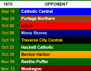 Gametime Conditions: Location: Muskegon, Michigan Date: October 2, 1970 Game Location: Kehren Stadium Geographic Coordinate: 43°13′8″N 86°16′20″W Game Start: 7:00 pm ET Sunset: 6:24 pm ET Condition: Mostly Cloudy 61 degrees 12 mph wind speed W wind direction Opponent Profile: 1970 Grand Rapids Union Michigan Sports Classification: Class A Colors: Red and White Nickname: Red Hawks…