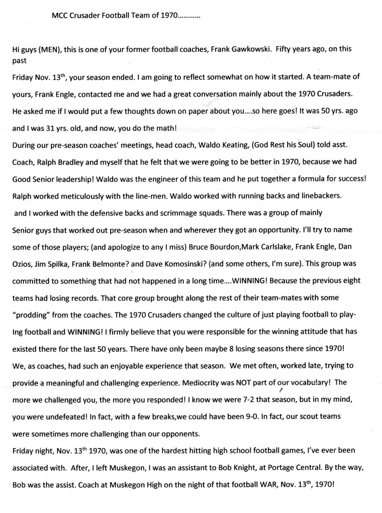 1970 Muskegon Catholic Central Crusaders Football 50th Anniversary – Coach Frank Gawkowski Message to 1970 MCC Football Team Published on November 27, 2020November 27, 2020 by crusader35 Asst. Coach Ralph Bradley (left), Asst. Coach Frank Gawkowski (standing), Head Coach Waldo Keating (seated) Friday, November 20, 2020 Share this: Click to share on X (Opens in new window) X Click to share on Facebook (Opens in new window) Facebook Like Loading... Related