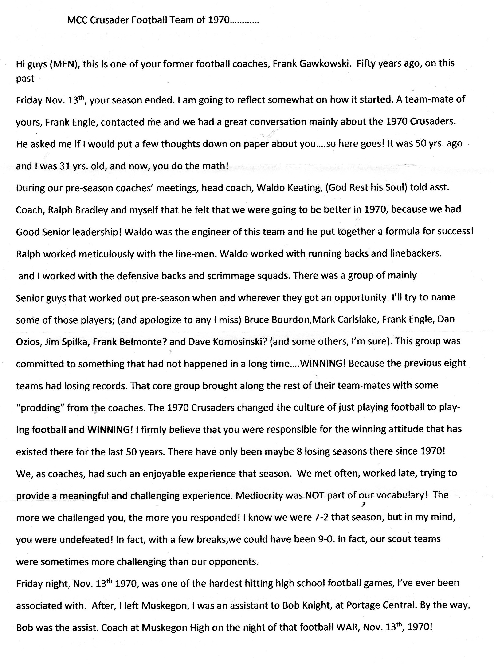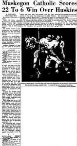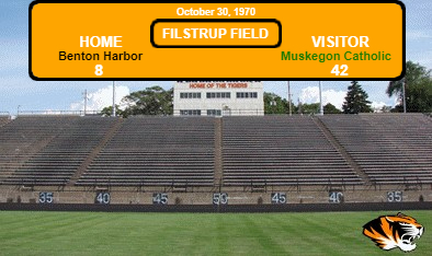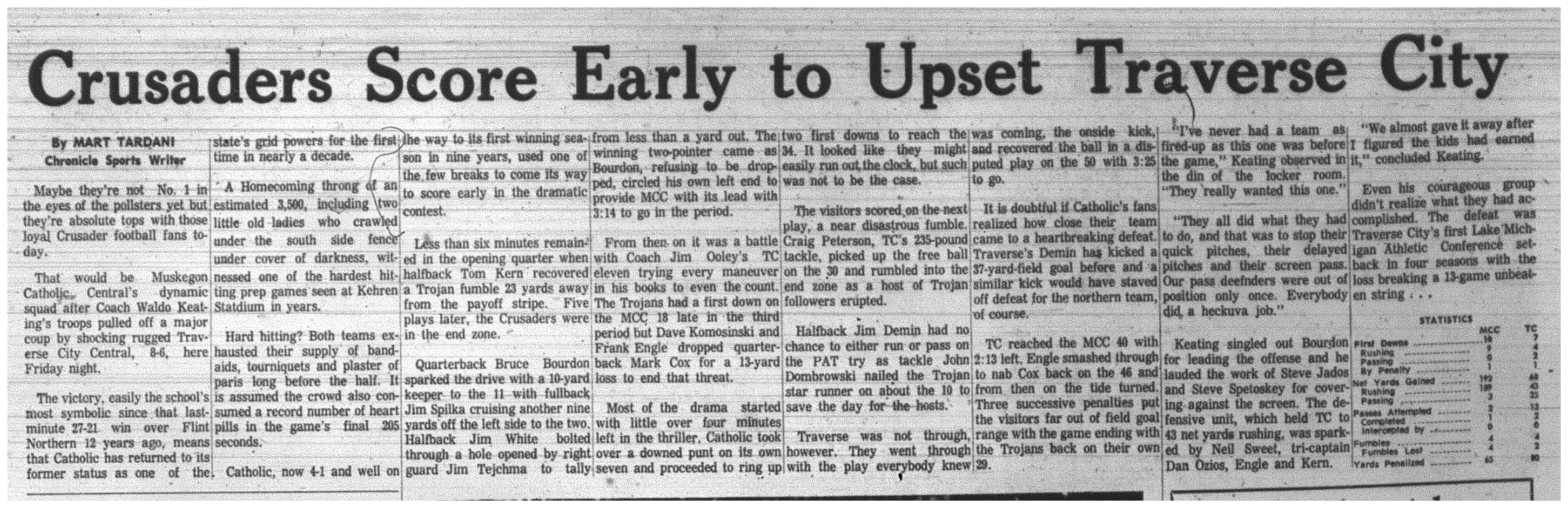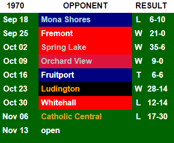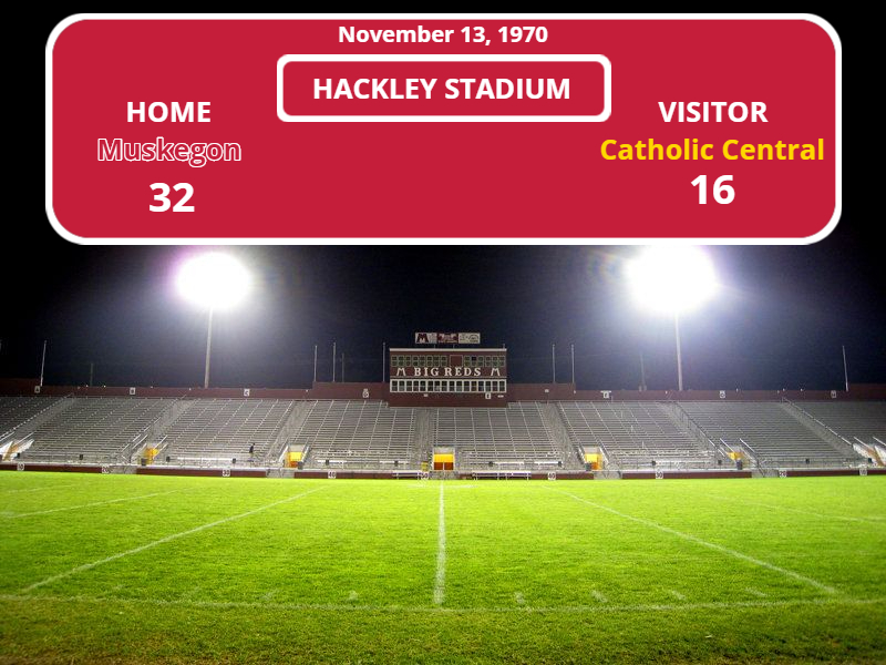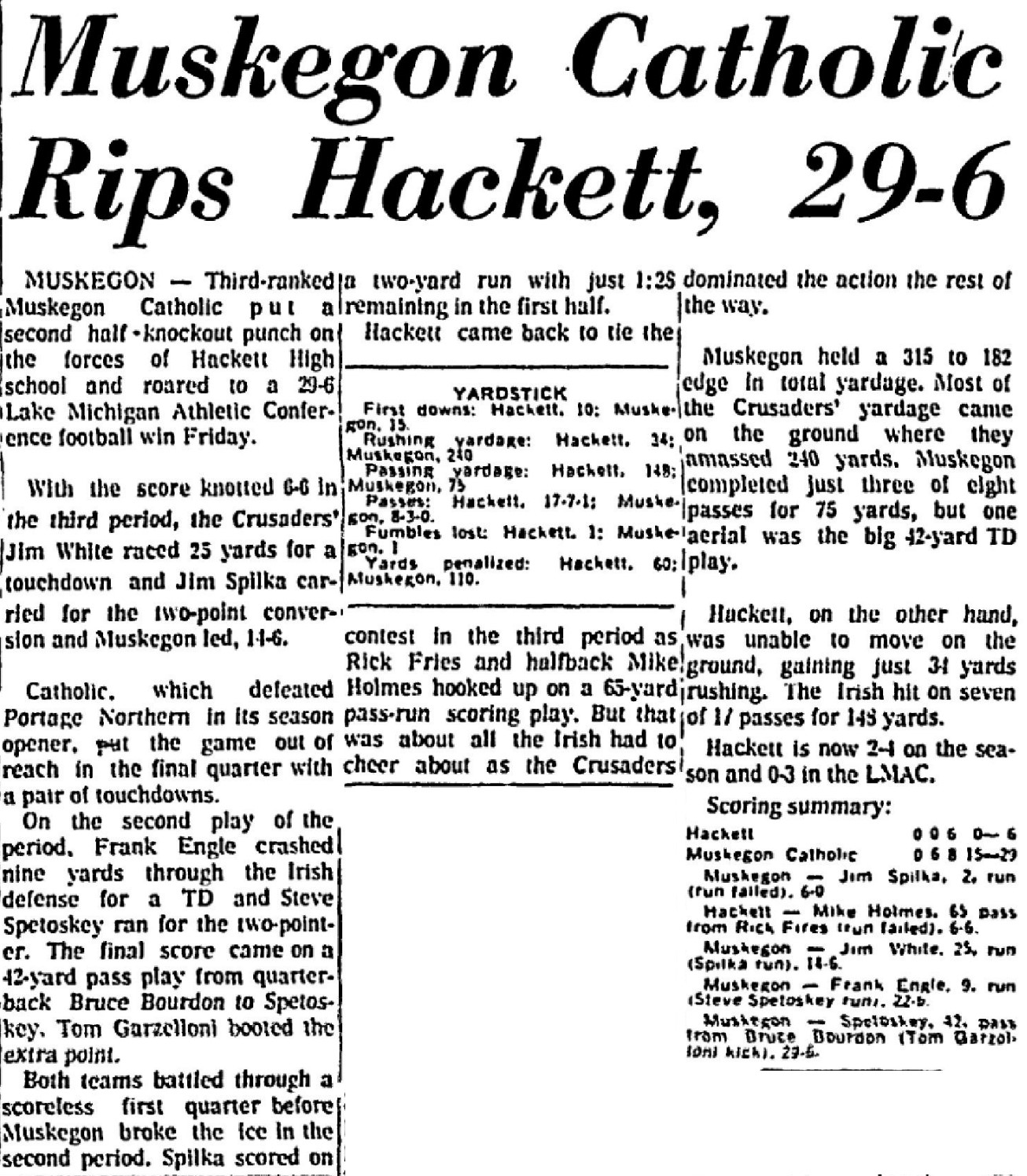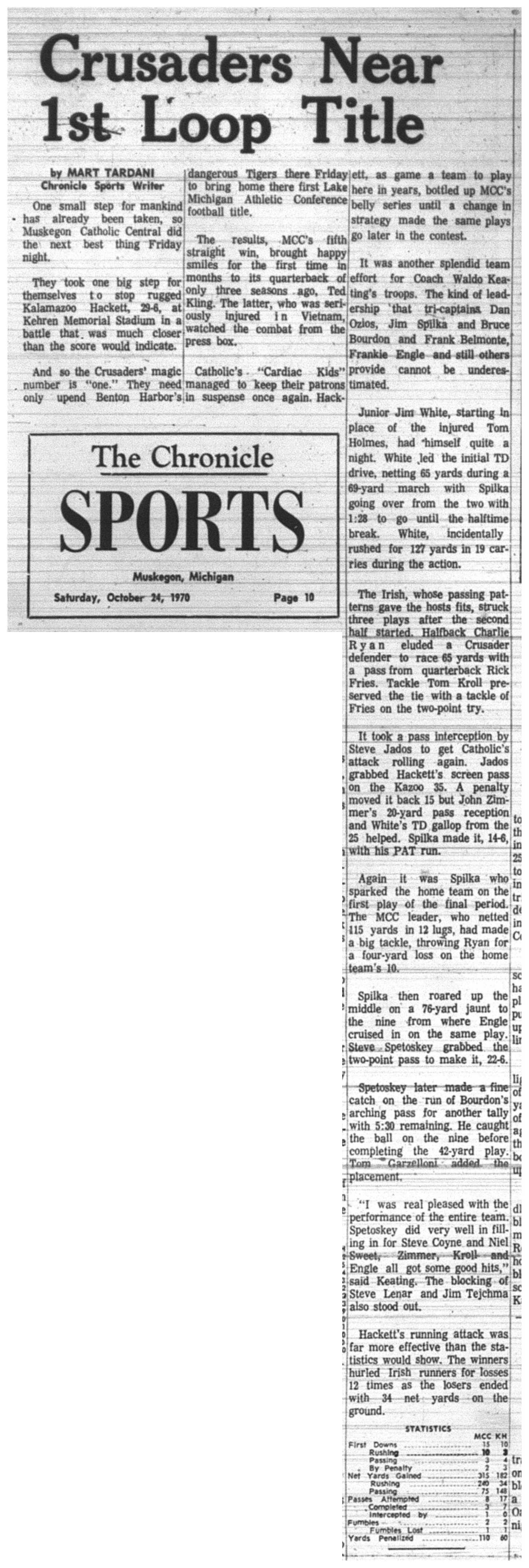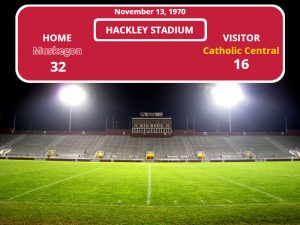 - The Muskegon Chronical article below is incorrect on one fact. The 1970 MCC 39 points against Class A GRU on Friday, October 3, 1970 was the first time in 5 years and 35 games that MCC scored more than 3 touchdowns, not 43 games like the Muskegon Chronicle reported . Ironically the previous game with more than 3 MCC touchdowns scored was also against GRU 5 years and 1 day earlier on October 1, 1966 with a 36 – 12 winning score.